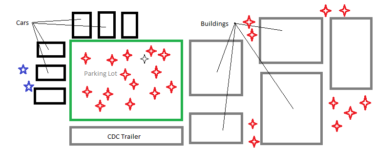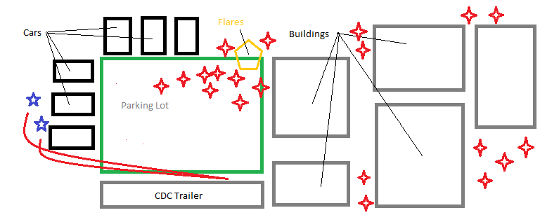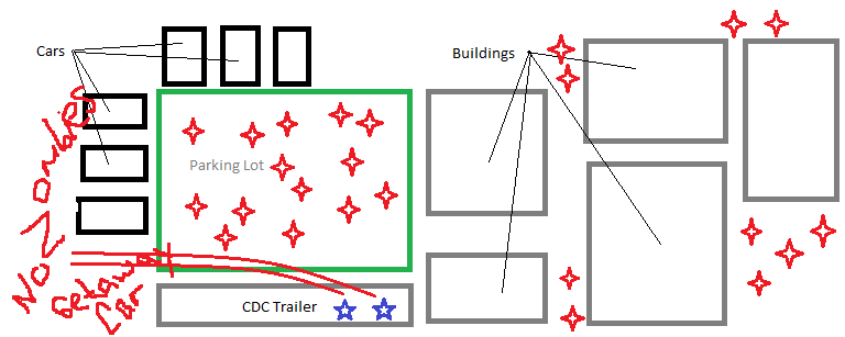 I know it says CDC Trailer and it’s actually FEMA but I don’t want to spend the minute it would take to fix it. OK. The blue stars on the left are Shane and Otis. The red things are the zombies. They scope it out, clearly without a plan even though Otis described it before they left. See, if it was me, I would have had one person drive the truck slowly towards the lot to draw the zombies out, then drive slowly away while the other guy raids the trailer, then go back and pick him up. Instead, they decide to open a police car’s trunk to see if there is something in there. I mean, they have no idea what they’re gonna find, but they’re like Fuck it, let’s check the trunk of this cop car. They find flares! Shane hatches a plan.