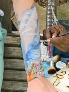 That’s bodypainter Vonetta Barry tattin’ up Bradley Nethercutt, the model for Gavin. Looking at this, I firmly believe I too could be a forearm model.